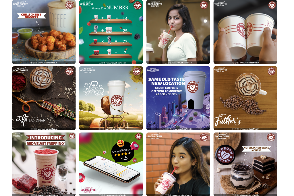Crafted mouth-watering visuals from latte art close-ups to cozy café corners capturing the vibe that keeps Crush Coffee trending on every feed.
